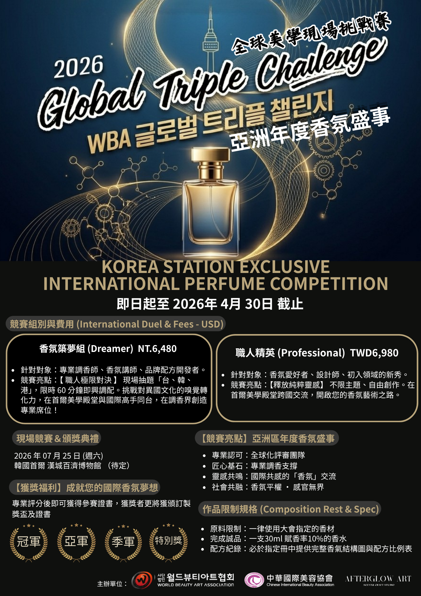 🌍【2026 WBA全球美學現場挑戰賽】WBA 跨國盛事:首爾榮耀巔峰風正式啟動! 邁向國際舞台,挑戰美學巔峰! 由「世界美學藝術協會 (WBA)」主辦的 2026 WBA Global Triple Challenge 全球美學現場賽 將於韓國首爾隆重登場! 結合經典項目:藝術面具、插畫、人體彩繪、香水調製 這不僅是一場競賽,更是一次與亞洲頂尖好手深度交流、展現台灣專業實力的絕佳機會。 🏆 競賽亮點國際級場域: 於韓國首爾競技場展開實境對決。 跨領域美學: 涵蓋藝術面具、插畫、人體彩繪、香水調製等多元項目。 專業認證: 全球化評審團隊,獲獎者將頒發訂製獎盃、獎狀,成就您的國際職涯。 📅 關鍵日期報名截止: 即日起至 2026 年 04 月 30 日 止。 競賽與頒獎: 2026 年 07 月 25 日(週六)。 🏆 關於大賽&競賽日程