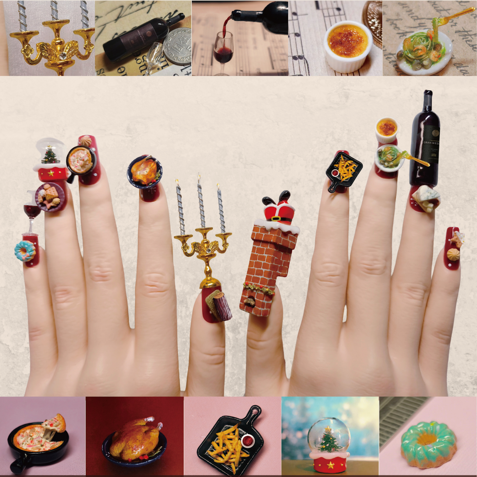 Nail works: Prepare 5 nail tips yourself. The works can include, but are not limited to, 3D creative gel designs, nail paintings, crystal - adorned nails, various patterns. There are no restrictions on size or materials. -