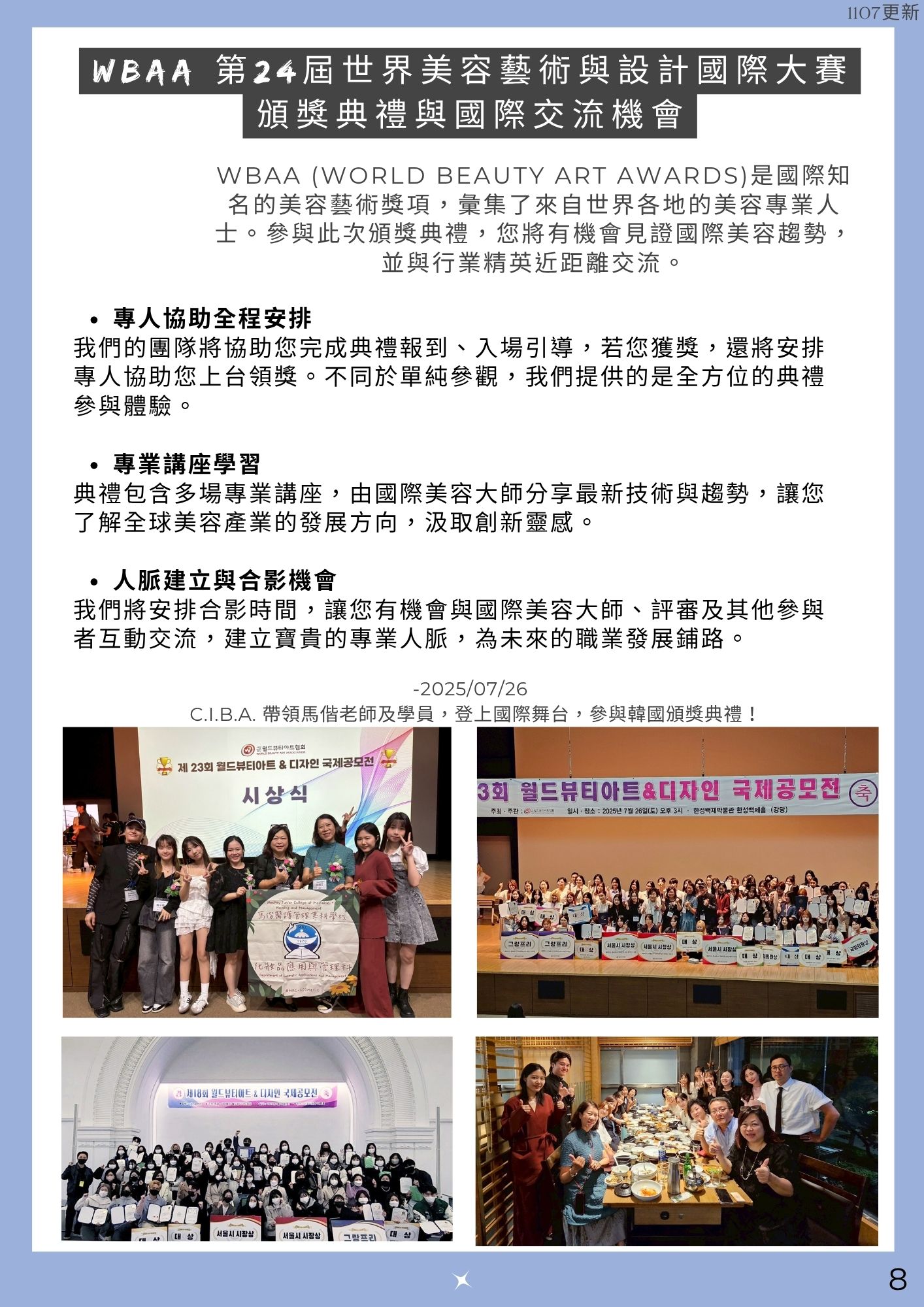 由中華國際美容協會主辦,特別為國際評審與美學專業人士設計。將以「國際評審美學研習團」的身分參加,透過豐富的韓國專業課程與文化交流行程,體驗韓流造型趨勢、參訪藝術大學與美學競賽活動。此次研習不僅強化專業視野,更是與全球美業專家交流的重要舞台。