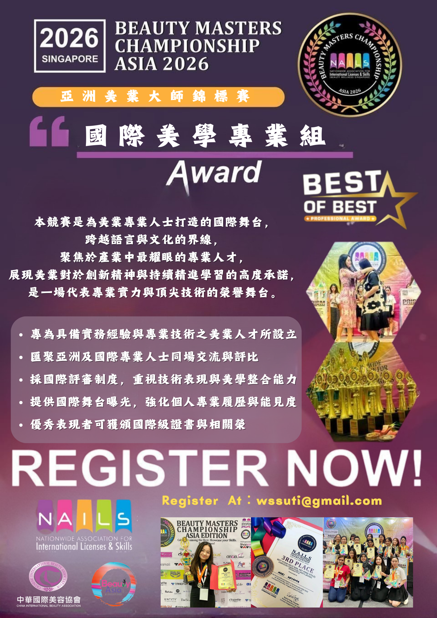 本競賽與新加坡 Beauty Asia 國際美容展覽會聯合舉行,不僅讓國際選手站上專業競賽舞台,更進一步串聯國際美容產業展會資源。參賽者除可累積寶貴的國際競賽經驗外,亦能近距離接軌全球品牌、原料商與產業趨勢,拓展國際視野,深化跨國交流與合作的實際機會。