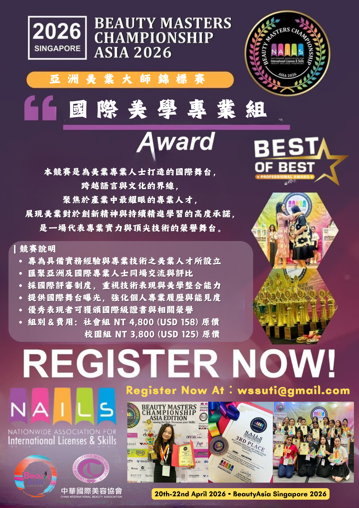 本競賽與新加坡 Beauty Asia 國際美容展覽會聯合舉行,不僅讓國際選手站上專業競賽舞台,更進一步串聯國際美容產業展會資源。參賽者除可累積寶貴的國際競賽經驗外,亦能近距離接軌全球品牌、原料商與產業趨勢,拓展國際視野,深化跨國交流與合作的實際機會。