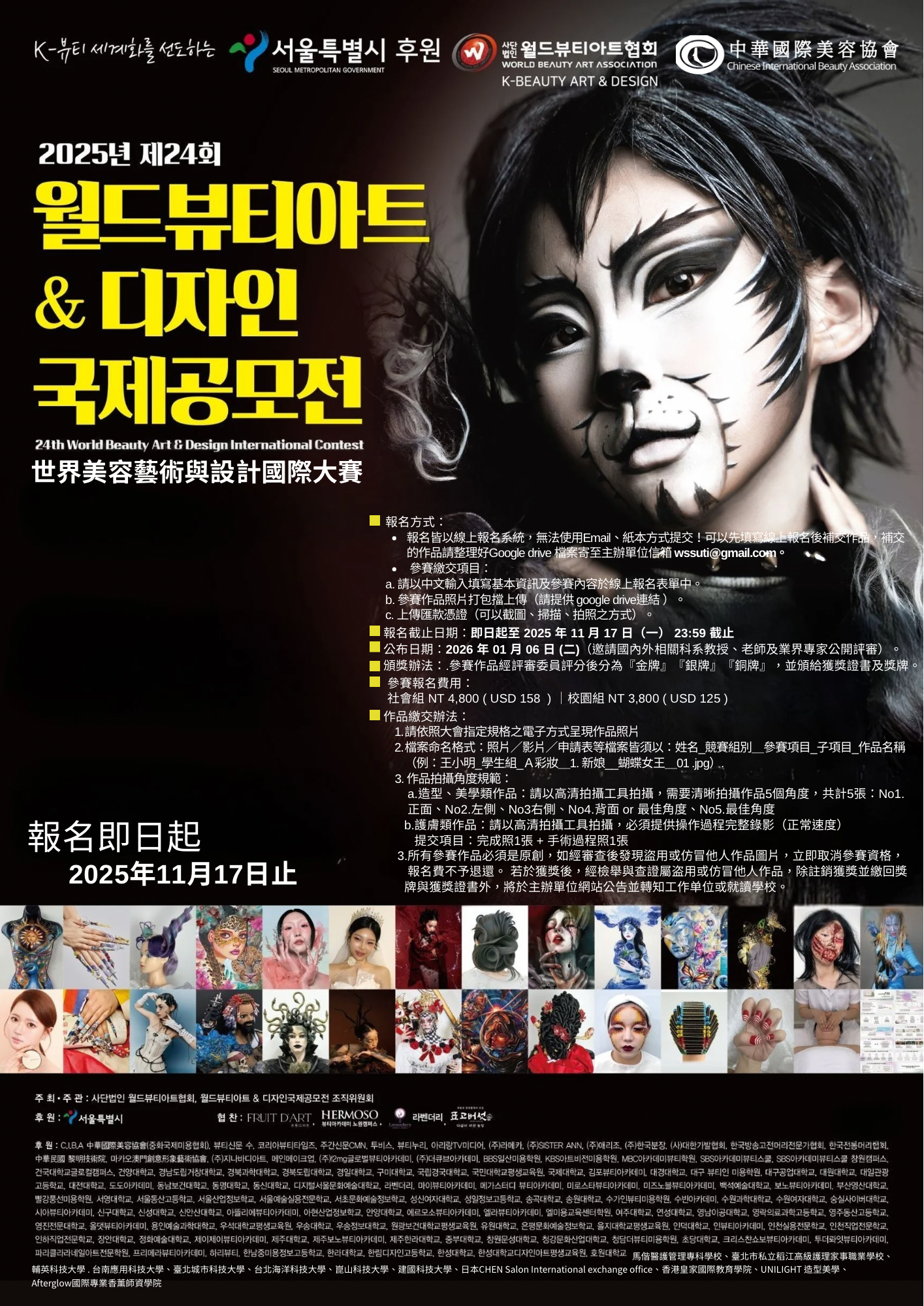 韓國主辦單位: WBAA 世界美容藝術設計協會 競賽名稱: 第24屆 世界美容藝術與設計國際大賽 報名截止:即日起至2025.11.17(週一) 23:59 頒獎典禮: 2026.01.24(週六) 韓國首爾